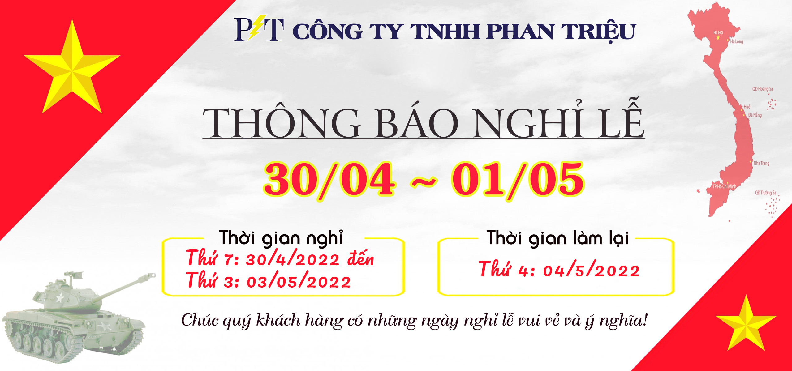 Công ty TNHH Phan Triệu trân trọng thông báo đến Quý khách hàng và Quý đối tác lịch nghỉ lễ 30/4- 1/5 năm 2022 như sau: